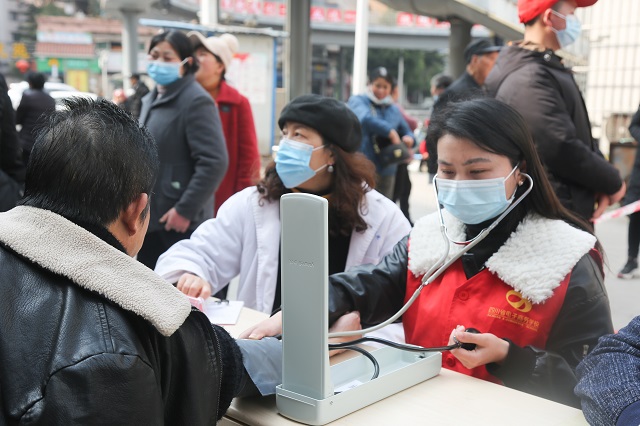 春日的午后,暖意融融,我校志愿者们还在世纪隆广场门口免费设立了心理咨询和血压检测点,居民群众纷至沓来,每个“摊位”前都挤满了人。我校心理学志愿者老师王丹、杨易灵对居民咨询的心理问题进行了具体的分析、耐心的安慰,并提出了解决措施及建议,以帮助他们减轻内心的压力,缓解焦虑的情绪。我校校医志愿者颜红英、崔玉梅老师一边进行血压检测,一边有针对性地讲解如何通过改善饮食等习惯来提高身体素质。志愿者们充分发挥特长,专心致志地为居民提供服务,讲解相关健康保健知识,亲切地和他们唠家常,现场笑声朗朗,祥和温馨。
