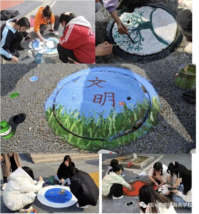 我校艺术设计与制作专业还开展了“井盖涂鸦”美化校园的志愿活动,此次活动不仅增强了志愿者们的服务意识,提高了专业实践水平,增添了校园的春天气息,美化了校园环境,还提升了同学们爱护校园、美化校园的意识。通过这样一种既有趣又特别的方式,将“美”的概念融入校园,能够引导同学们感受美、发现美、创造美。