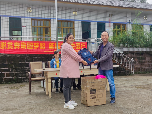 图为校党委委员、副校长于忠诚同志向小学捐赠书包