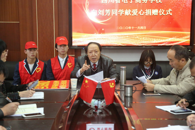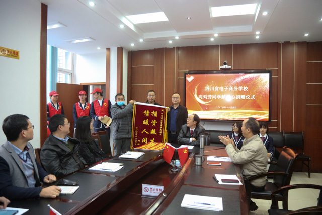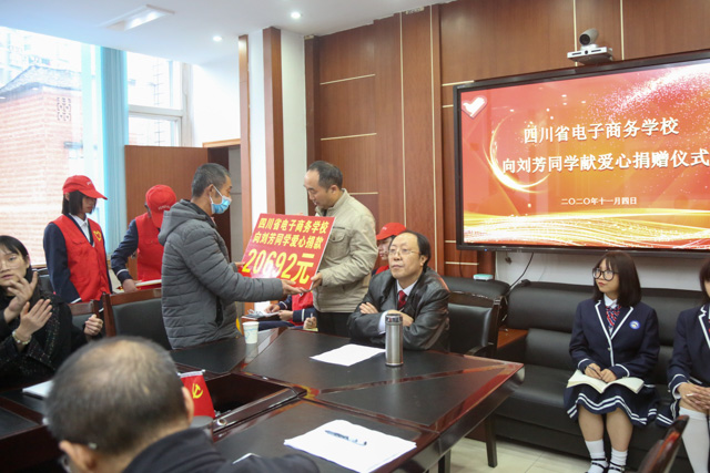 1026日,校团委、学生科在全校发出倡议,学校各科室、全体班主任、青年志愿者协会大力发动,认真组织,广大师生积极响应,真情奉献,为刘芳同学献爱心募集善款共计20692元。114日下午,学校领导、相关科室负责人、班主任代表、家委会代表、青年志愿者代表、2020级美术设计与制作班同学代表及刘芳同学的父亲刘志宪先生齐聚学校行政会议室,出席向刘芳同学献爱心捐款仪