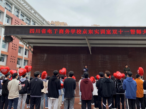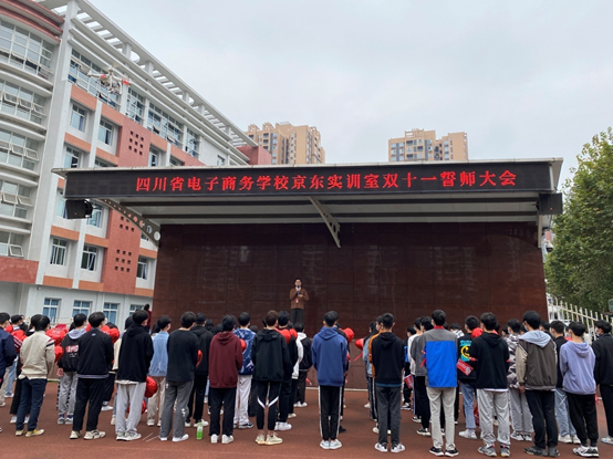 “四川省电子商务学校京东实训中心”于2021年11月4日下午14点30分,在学校操场隆重举行了京东实训 “双十一”誓师大会。校长助理饶仕成、行政办、实训科、网络信息、学生科、校团委、信息技术等负责人及全体实训学生参加了本次大会,会议由实训学生代表周子鑫主持。
