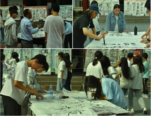 活动中,热爱书法的老师们纷纷亲临现场,为同学们认真讲解软笔字执笔方法和运笔技巧,同学们个个满怀激情,在练习中,每一个笔画、每一个汉字都一丝不苟,整个校园墨香四溢。
