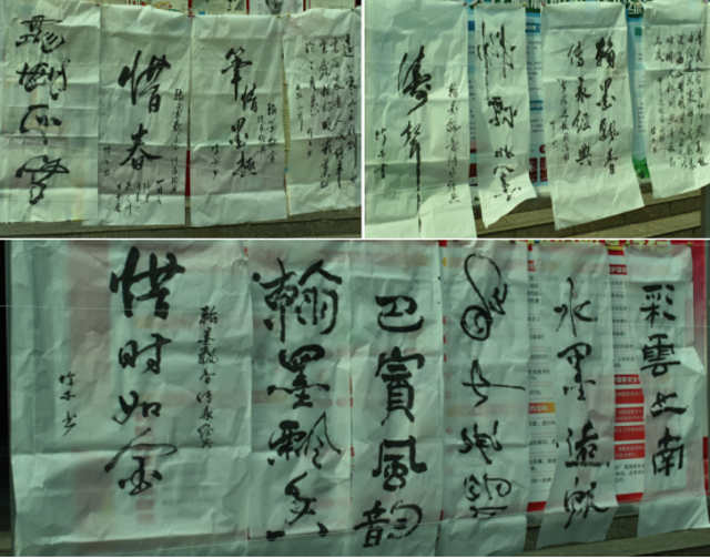 在活动现场,农工民主党执委肖良竹老师挥笔题写了“翰墨飘香,传承经典”“惜时如金”“惜春”“涛声”等数幅字画,市政协委员张纪唐老师执笔题写了“巴蜀风韵”“蜀中无将”“翰墨飘香”等多幅字画,字迹行云流水,落笔婉若流烟,字画在校园广场展台上装饰一新变身“艺术长廊”,给师生们带来了一场精彩的文化盛宴。