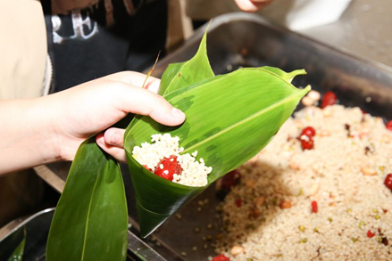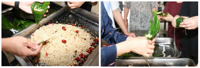 结果虽甜,过程不易。“师傅”们手把手地教,“徒弟”们一招一式地学。大家边包粽子,边唠“家常”,谈笑间一个个可爱、鲜绿的“生命”就在这一道道有条不紊的工序中诞生了,几个粽子包下来,同学们也都找到门道,变得“熟能生巧”,手势也显得模有样。