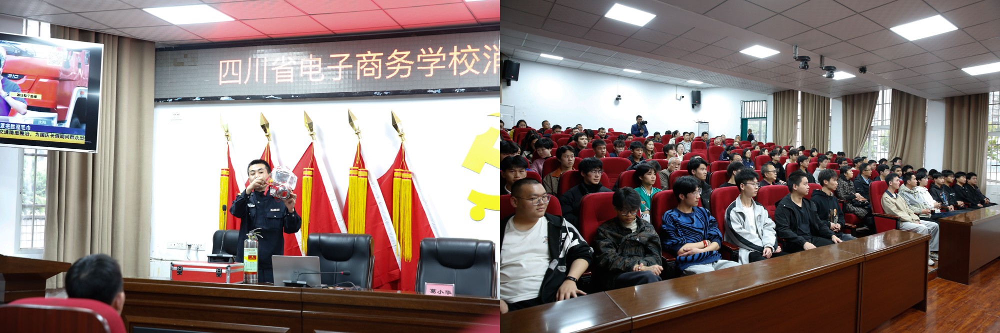 演练结束后在会议室举行了消防安全知识专题讲座,教运用视频、图片资料,结合生活中的典型真实案例,生动形象地阐释了“预防为主”的重要性,着重介绍日常用气与用电方面的安全知识,灭火器等消防设备的使用方法以及火灾发生时的逃生技能。讲座内容重点突出,实用性强,让师生对常见火灾预防、消防器材运用等有了更进一步的了解,提高了师生消防安全意识。