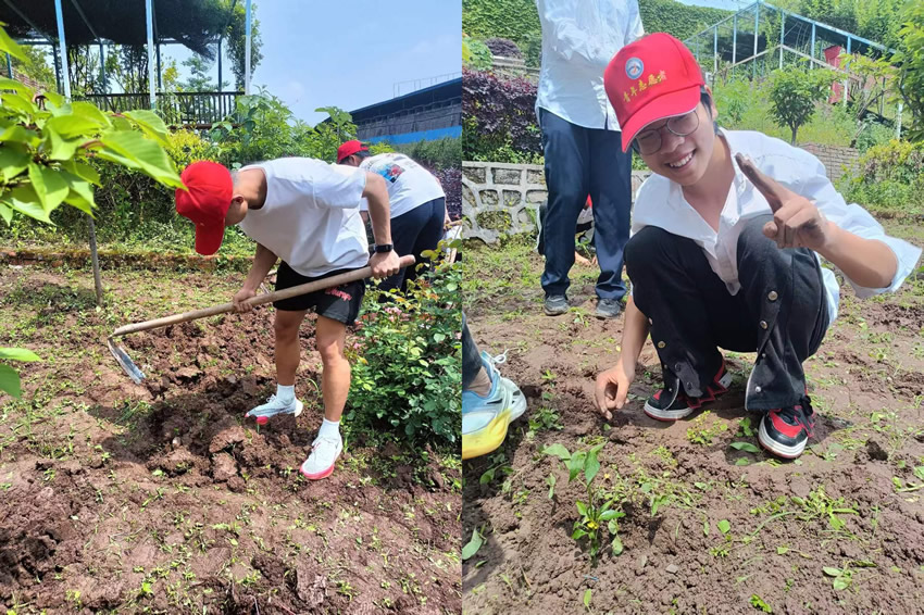 带队老师向同学们讲述了自己童年时代参与劳作的故事,并与同学们一起参与到种植作物的过程中,师生相互“比拼”,真正体现了劳动场面的“热火朝天”。