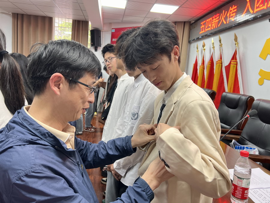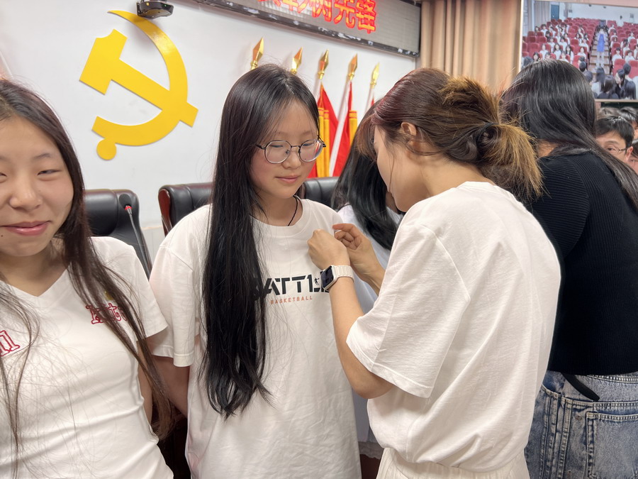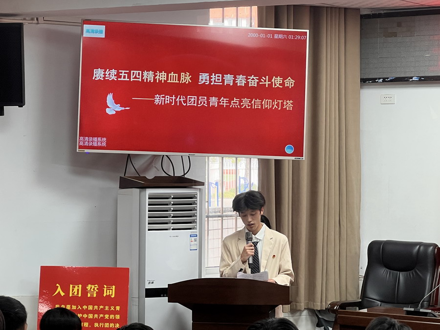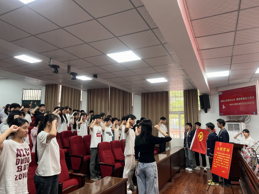活动在庄严的国歌声中拉开帷幕。新团员们上台,由老师为其佩戴团徽并勉励他们牢记团员身份,发挥模范带头作用。在团旗下,团员们高举右拳,庄严宣誓。铮铮誓言响彻会场,展现了团员们的坚定信念和昂扬斗志。