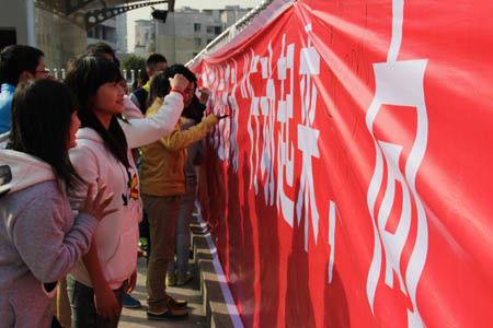 启动仪式结束后,全体与会领导与广大师生一起在“行动起来,向‘零’艾滋迈进·万人签名:防艾滋,我们共承诺”横幅上签名。随后,全校学生踊跃报名参加了校园防艾知识问答比赛和趣味主题游戏。活动现场每个人都佩带了红丝带。