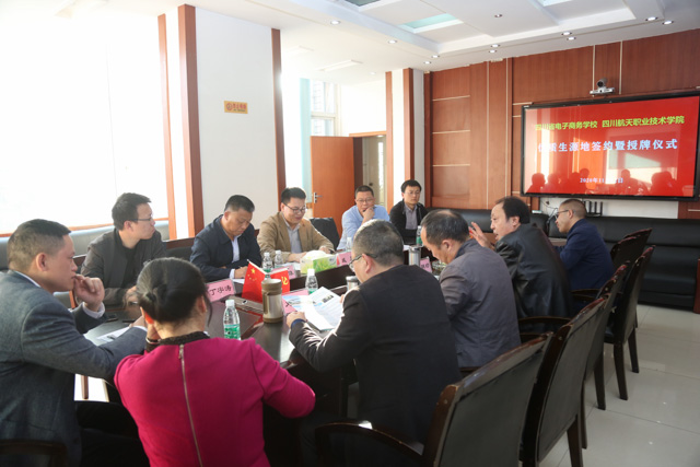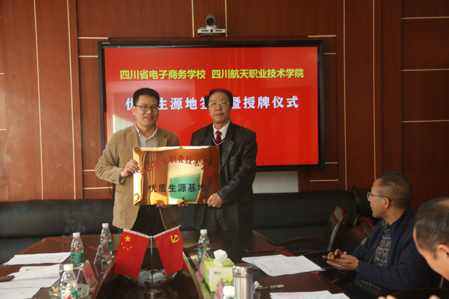 座谈会上,校党委委员、副校长于忠诚同志详细介绍了学校的办学情况。四川航天职业技术学院学院副院长戚炎介绍了该院发展历史、师资力量、办学条件、就业等相关情况,并希望能与四川省电子商务学校长期合作,进一步实现师资共用、实训室共建、教学资源共享、教育成果共进,共同创造属于职业教育的辉煌。信息技术教研室、质量管理办公室、示范专业办公室副主任吴岚介绍了我校电子商务省级示范专业建设工作推进情况,并就与四川省航天职业技术学院开展校校合作的《电子商务专业建设校际合作协议》进行了洽谈并达成共识。会上,双方签订了优质生源地协议并举行了授牌仪式。四川航天职业技术学院学院副院长戚炎就我校电子商务省级示范专业建设给予了指导与建议。