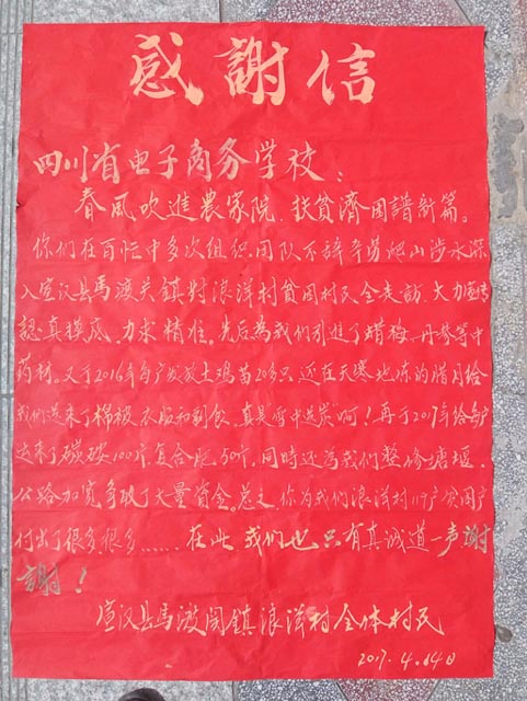 考虑到正值春播时节,校党委此次专门还为所有对口帮扶对象每户送去了100斤碳铵及50斤复合肥,并由调研组逐户亲自发放到了村民手中。浪洋村全体村民十分感动,为表达对我校在精准扶贫工作中对他们一直以来的帮助和付出,村民们真诚地给学校送来了感谢信,并由村民代表现场进行了宣读,以表达全体村民的感恩之心。