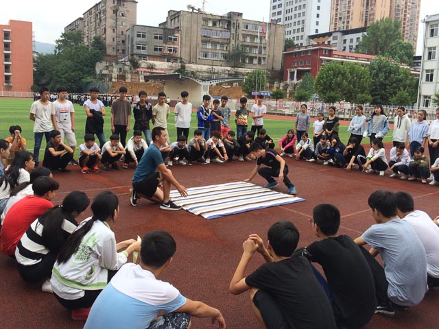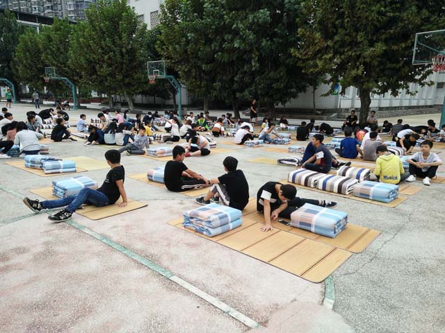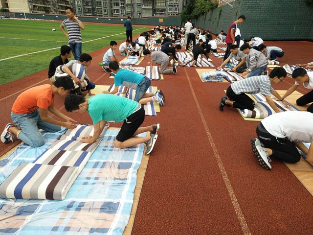 为创建洁静优美的寝室环境,促成学生良好生活习惯的养成,提高学生整理内务的能力,2017年9月26日下午课外活动时间,二大队(由2017级“准军事化”管理班级构成)全体学生带上凉席、被子齐聚足球场,涌跃参加了宿舍内务重头戏----叠被子的集训活动。学生科相关人员全程观摩了此次活动。