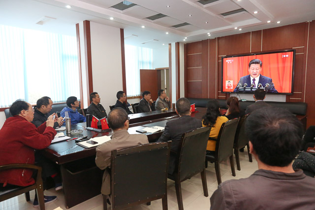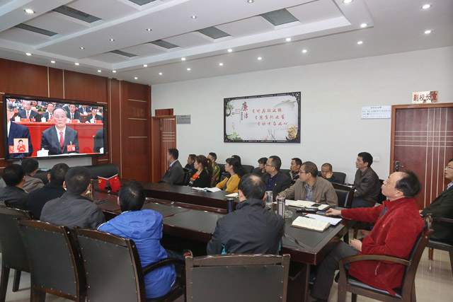 10月18日上午9时,举世瞩目的中国共产党第十九次全国代表大会隆重召开。我校全体党员同志佩戴党徽,在行政楼三楼会议室集中收看了党的十九大开幕盛况直播。