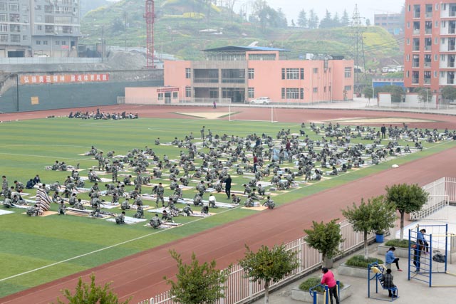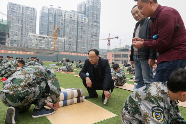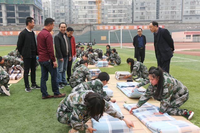 三月十三日下午,春光明媚,宽敞整洁的足球场上正在上演一场精彩纷呈的学生素质拓展----“导弹”拦截大比拼和内务整理叠被训练活动,参加者为我校两个年级“准军事化”管理班级一、二大队的全体同学,他们身着统一校服----迷彩训练装,个个精神抖擞,意气风发。两个大队的负责人陈艳文和李雪锋老师,分别指挥两个营地的训练活动,专职班主任积极配合,同学们参与的热情异常高涨。