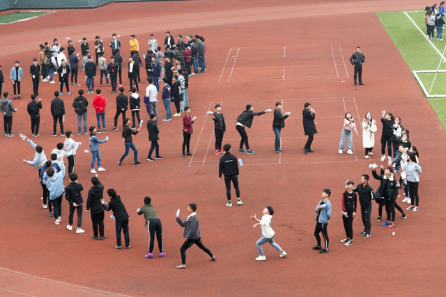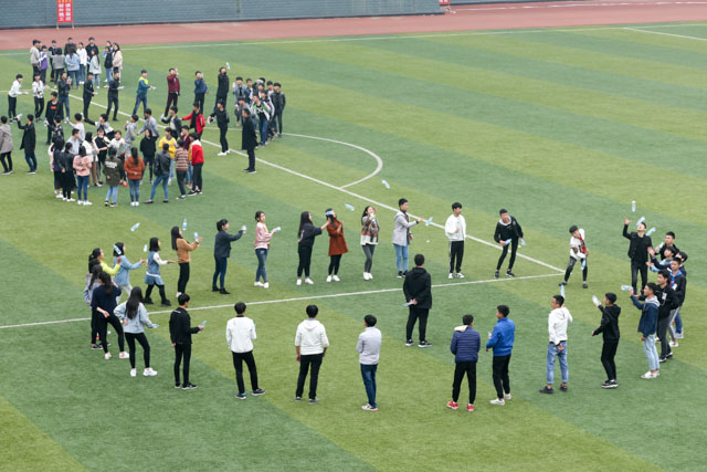 当领导一行来到另一营地时,一大队的同学也是热闹非凡,笑声欢呼声响彻一片,五个小组的同学各自围成了一个大大的圆圈,他们左手背在身后,右手握着一个矿泉水瓶,在圆圈中心一位同学的指挥下,正在练习“导弹”拦截技术。